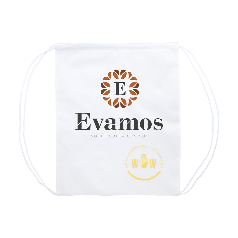 Rugzak gemaakt van maisafval, PLA materiaal van maïszetmeel. Met aanrijgkoorden. Inhoud ca. 8 liter. Het bijproduct van mais wordt PLA genoemd. PLA (polyactinezuur) wordt meestal gemaakt van de suikers in maïszetmeel, cassave of suikerriet. PLA is 100% biologisch afbreekbaar en 100% composteerbaar. Om van mais een soort van plastic (PLA) te maken worden de maiskorrels met sulfur dioxide in heet water gemengd, waardoor alle compenten in dit mengsel zich weer ontwikkelen tot zetmeel, proteïnen en vezels. Van de vezels wordt garen gemaakt en zo kan er een tas van ontwikkeld worden. Op de tas is het logo van “bio bag compostable – made of corn” standaard gedrukt.
