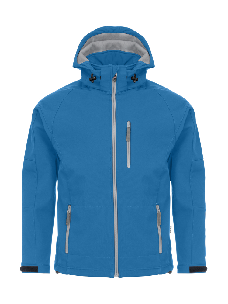 Softshell jas met contrasterende microfleece aan de binnenzijde. Wind- en waterbestendig (WP3000/MVP2000), afritsbare capuchon en manchetten verstelbaar met velcro. Elastisch trekkoord met stopper aan de capuchon en onderaan de zoom. Eén borstzak, twee zijzakken en één binnenzak.