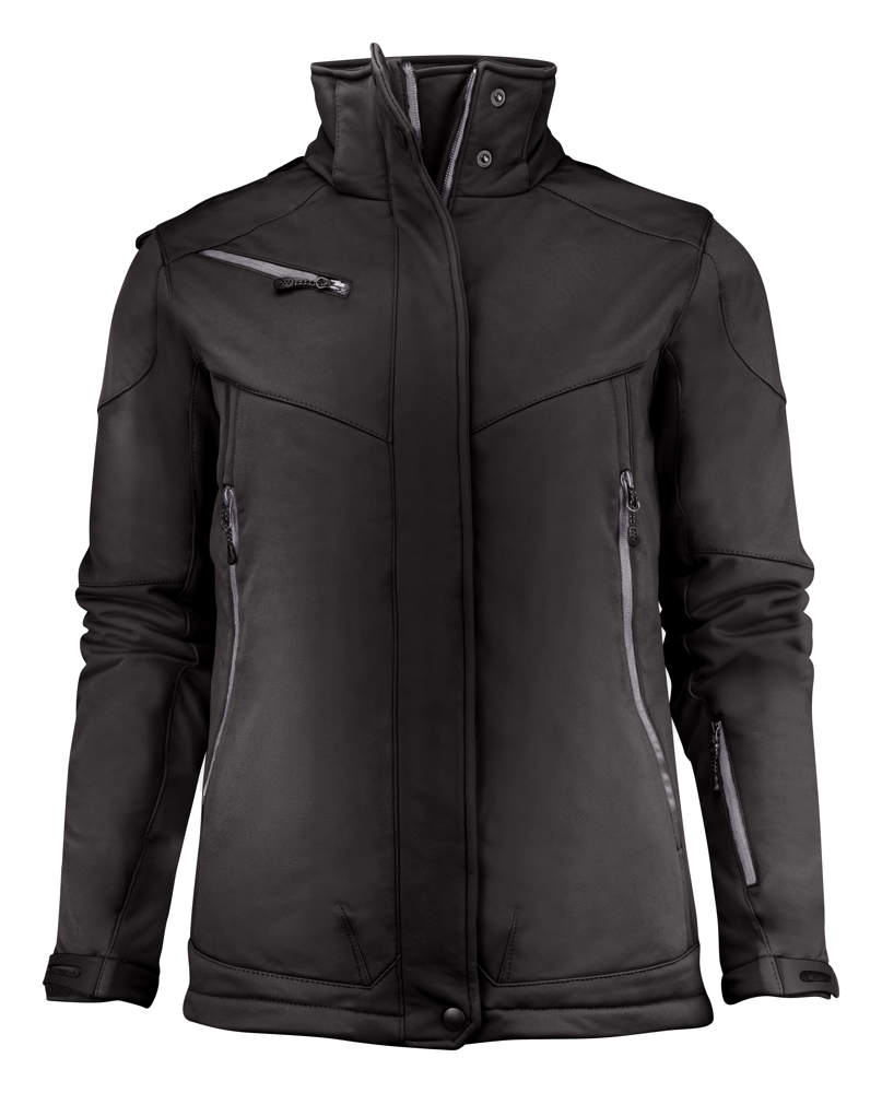 Gevoerde softshell met afneembare capuchon, voorgevormde mouwen en trekkoord onderaan de zoom. De mouwen zijn verstelbaar met een velcro. Voorzakken en borstzak met ritssluiting, twee binnenzakken met ritssluiting en een zak in membraanvoering.