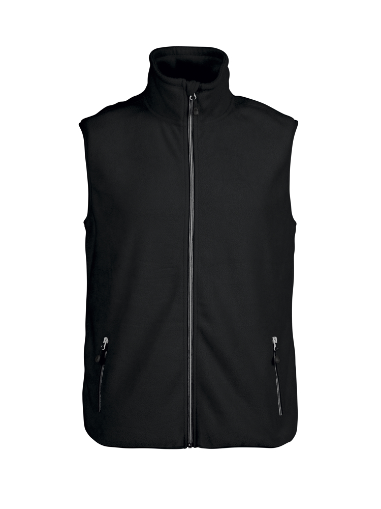 Geborstelde bodywarmer met lange ritssluiting voor dames en heren. Geborsteld aan beide zijden. Twee voorzakken, contrasterende ritssluitingen en decoratieve stiksels. Elastische tape aan de boord onderaan.