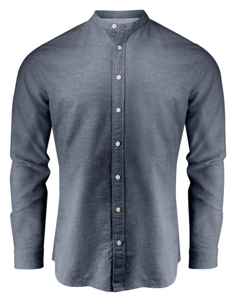 Linnenblend hemd met Mao kraag en aanpasbare manchetten. Parelmoer knopen. Contraststof aan de binnenkant van de schouderpas en manchetten. Garen geverfd.