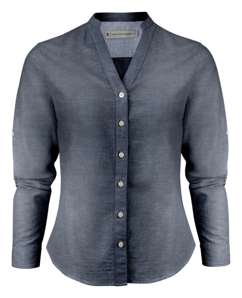 Linnenblend hemd met Mao kraag en aanpasbare manchetten. Parelmoer knopen. Contraststof aan de binnenkant van de schouderpas en manchetten. Garen geverfd.
