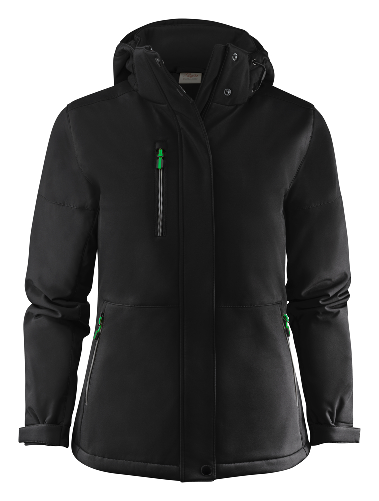 Gevoerde softshell jas met afneembare capuchon en stormflap met drukknopen. Aanpasbare mouwen met velcrosluiting en trekkoorden aan de capuchon en de zoom. 2 binnenzakken met ritssluitingen. Reflecterende piping op de rug. Uitscheurbaar neklabel en afzonderlijk geweven maatlabel. Aan de binnenzijde van de linkerzijnaad werd een zakje voorzien voor het innaaien van een waschip. De zippullers kunnen indien gewenst vervangen worden door één van de andere beschikbare kleuren. Oeko-Tex 100 gecertificeerd.