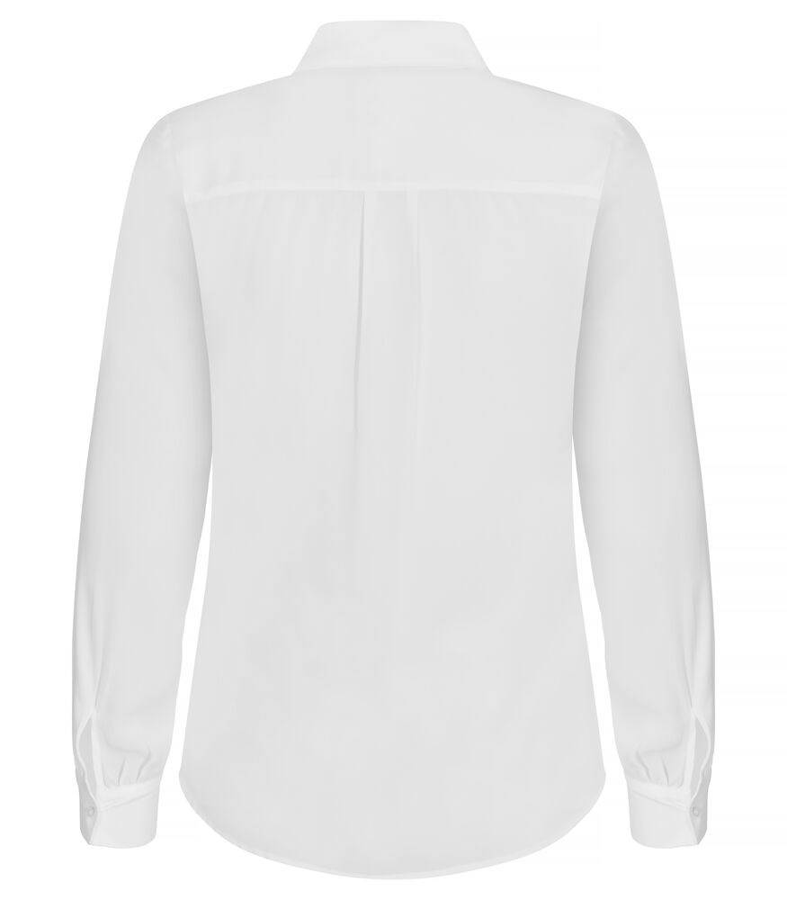 Een tijdloze klassieke blouse. Gemaakt van een lichte en semi-transparante stof die mooi soepel valt. De blouse is voorzien van een verborgen knoopsluiting en plooien aan de voorzijde en mouwuiteinde. Voorzien van een schouderpas aan de achterzijde.