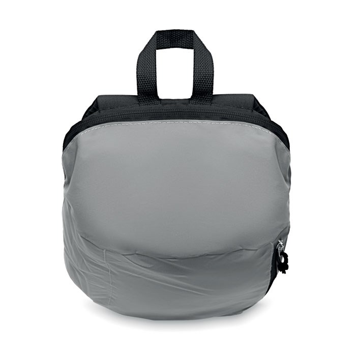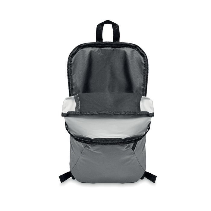 Rugzak van stevig 600D polyester met hoog reflecterend front voor extra zichtbaarheid, handig ritsvak en gewatteerde achterzijde voor extra draagcomfort.