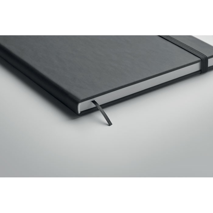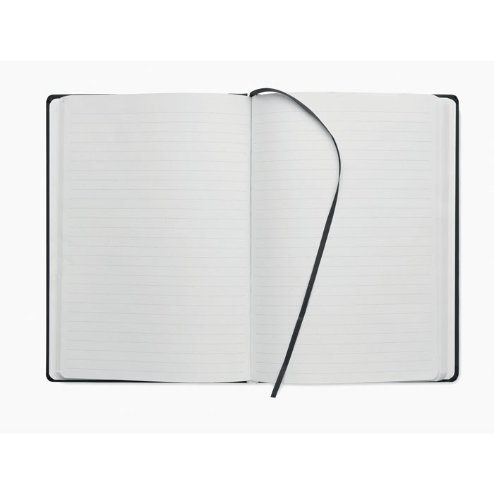 A5 notitieboekje met harde PU kaft. Kaft gebonden. 200 gelinieerde pagina's (100 vel) in gerecycled papier (80 g/m²). Bijpassende elastische sluitingsband en leeslint. Gemaakt in de EU.
