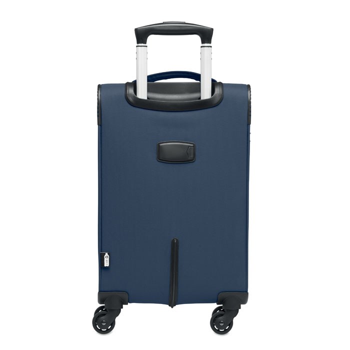 Handbagage trolley van 600D RPET Polyester. Inclusief buitenvak met rits voor laptop, voorvak met rits, combi slot en bodemvak. Dubbel buisframe. 210D voering RPET en PU details.