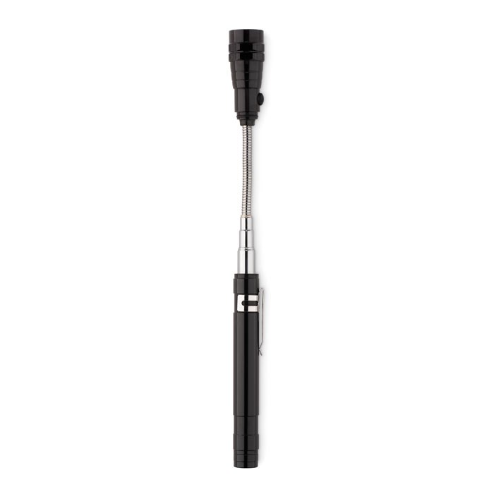 Uitschuifbare aluminium zaklamp met 3 LED lampjes, magneet en clip. Inclusief 4 LR44 batterijen. Maximum lengte 57 cm.