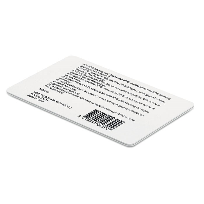 Met deze aluminium kaart kun je je passen veilig opbergen in je eigen portemonnee. Plaats simpelweg alle kaarten die je wilt beschermen tegen skimming achter deze kaart in je portemonnee. (0,76 mm).