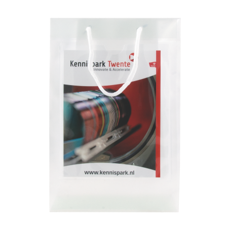 Transparante polypropylene tas recyclebaar 200 x 255 x 80 mm, met koord 5 x 150 mm, en 2 vensters met A5 inlay