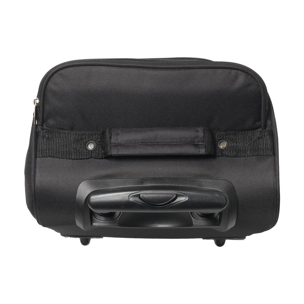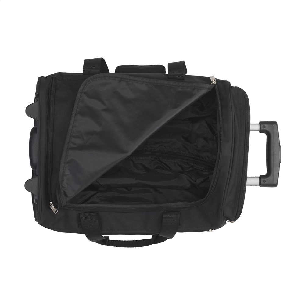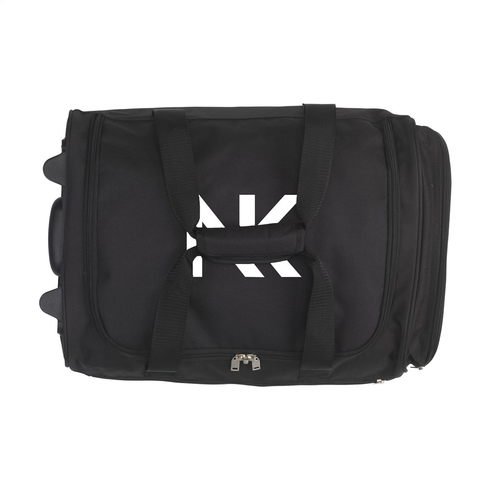 Praktische, cabine goedgekeurde, 18” trolley-/weekendtas van 600D polyester. Met uitschuifbare handgreep, 2 wielen, draaglussen en een handgreep. Dit biedt de mogelijkheid om de tas op verschillende manieren te vervoeren. De tas heeft een royaal hoofdvak, 2 ritsvakken en een gaasvak met rits aan de binnenzijde. Inhoud ca. 35 liter.
