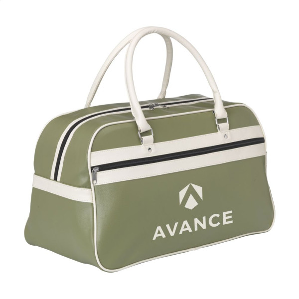 PVC/PU sporttas in jaren '70 look met gevoerde binnenzijde, hoofdvak en ritsvak, 2 stevige handgrepen, inlegbodem en beschermnoppen. Afgewerkt met hoogwaardige materialen die een lange levensduur garanderen. Inhoud ca. 21,5 liter.