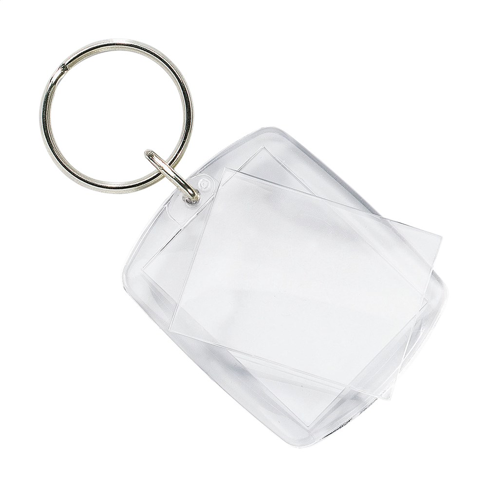 Sleutelhanger van loepzuiver plexiglas (acryl). • Zonder opdruk: Levering zonder inlegvel en in losse onderdelen. Transparante onderdelen per 500 stuks in plastic zak. Behuizing met sleutelring per 500 stuks in plastic zak. Plexiglas plaatjes per 500 stuks in plastic zak. Ook bij kleinere aantallen worden de onderdelen gesorteerd geleverd. • Met opdruk: Levering met inlegvel en gemonteerd. Afm. inlegvel 4 x 3 cm.