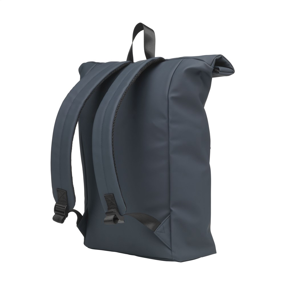 Praktische, stevige en royale ‘roll-top’ laptoprugzak met extra ritsvak aan de voorzijde. Deze rugzak heeft aan de bovenzijde niet alleen een handige rolsluiting met klittenband maar ook een ritssluiting. Deze rugzak is gemaakt van waterafstotend PU, 5% gerecycled PU en 42% gerecycled polyester. De rugzak heeft een keurig afgewerkte voering van gerecycled PET en is van alle gemakken voorzien. Het royale binnenvak heeft een speciaal laptopcompartiment voor het veilig vervoeren van een laptop (tot 15.6 inch) of tablet. Verder vind je aan de binnenzijde verschillende insteekvakken voor het georganiseerd opbergen van een mobiel, schrijfwaren of andere accessoires. Door gebruik te maken van de elastieke band aan de binnenzijde blijft een drinkfles rechtop op zijn plek staan. Met handige draaglus. Voor extra draagcomfort zijn de rugzijde en verstelbare schouderbanden voorzien van zacht foam. Deze rugzak is perfect voor dagelijks gebruik en neem je gemakkelijk mee naar school of naar je werk. RCS-gecertificeerd. Totaal gerecycled materiaal: 47%. Inhoud ca. 19 liter.