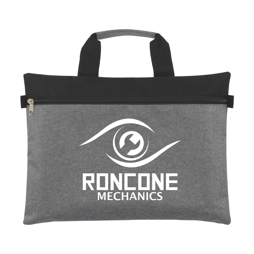 Ruime documententas van 300D Oxford polyester in chique combinatie van heather grey en zwart. Met verstevigde handgreep, binnenvoering en rits.