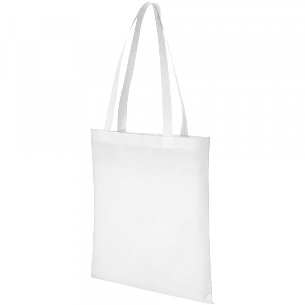 Een goede tas nodig voor een beurs of conferentie? De Zeus grote non-woven draagtas is een perfecte optie. Door zijn slanke ontwerp is het een elegant model en geschikt om lichte voorwerpen zoals een notitieboekje en een pen in mee te nemen. De hengsels zijn 29 cm lang en dus gemakkelijk over de schouder te dragen. Geschikt tot 5 kg gewicht.