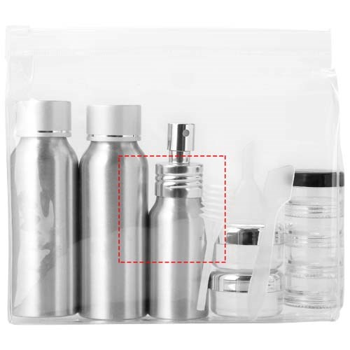 Bevat 2 x 80 ml aluminium flessen, 1 x 30 ml aluminium spray, 2 x 0,5 gram potjes, 1 x 4-laagse pot, een trechter, spatel en zuignapje. Accessoires verpakt in een aparte polybag. Decoratie is alleen mogelijk op de hoes.