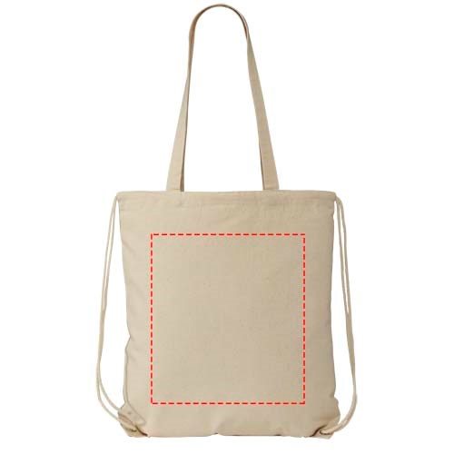 Multifunctionele katoenen tas met lange handgrepen en trekkoord die als schoudertas of rugzak kan worden gedragen. Groot hoofdvak met trekkoordsluiting. Voorzien van twee uitklapbare handgrepen met een lengte van 31 cm. Capaciteit: 6 l, weerstand tot 5 kg gewicht.