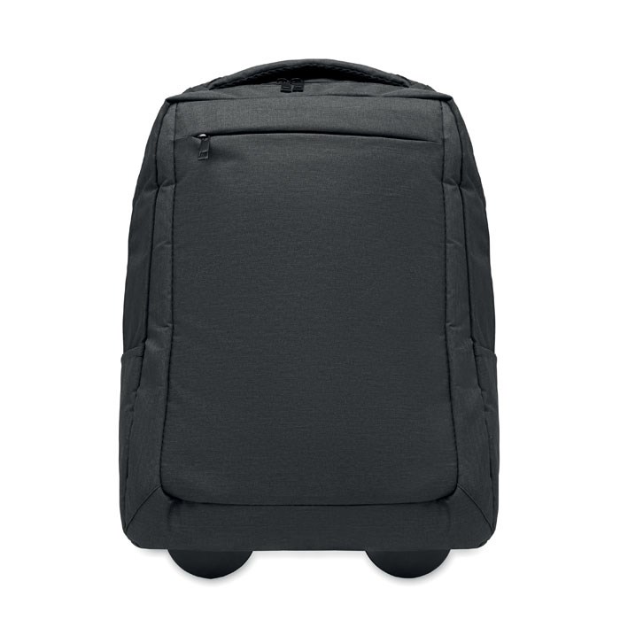 15 inch laptop rugzak trolley met wielen in 600D RPET polyester. Inclusief een binnenvak voor een 15 inch laptop. Voorvak met rits. Twee zijvakken. Drie insteekvakken. Gewatteerde rug- en schouderbanden. 2 wielen en dubbel buizenframe.