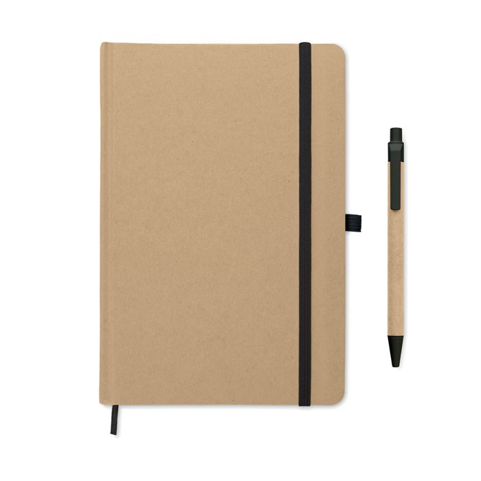 A5 notitieboek met harde gerecyclede kartonnen kaft. Ingebonden. 160 gelinieerde pagina's (80 vellen gerecycled papier). Elastische sluitingsband en pennenlus, bladwijzer met lint. Balpen met drukmechanisme en behuizing van gerecycled papier. Blauwe inkt.