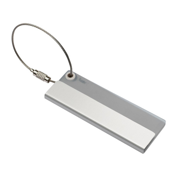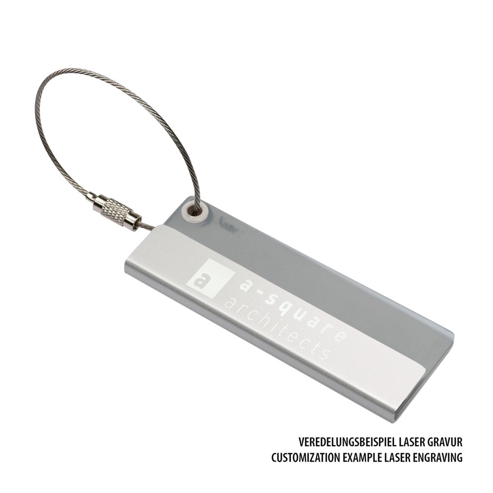 Onvervalste charme: het bagagelabel van zilverkleurig metaal en lichtgrijs acryl is een chique reisgenoot. Het adreslabel met matzilveren kabel en graveerplaatje is perfect voor iedereen die het onopvallend maar stijlvol wil hebben. Kan worden afgewerkt met een eenvoudige lasergravure of tot twee-kleuren tampondruk.