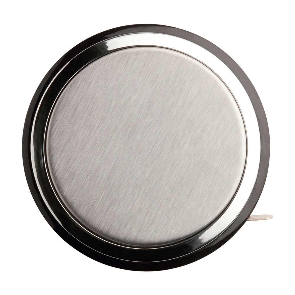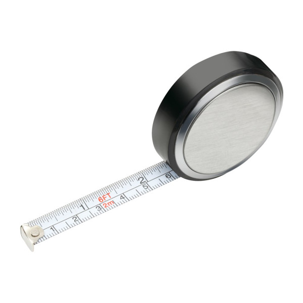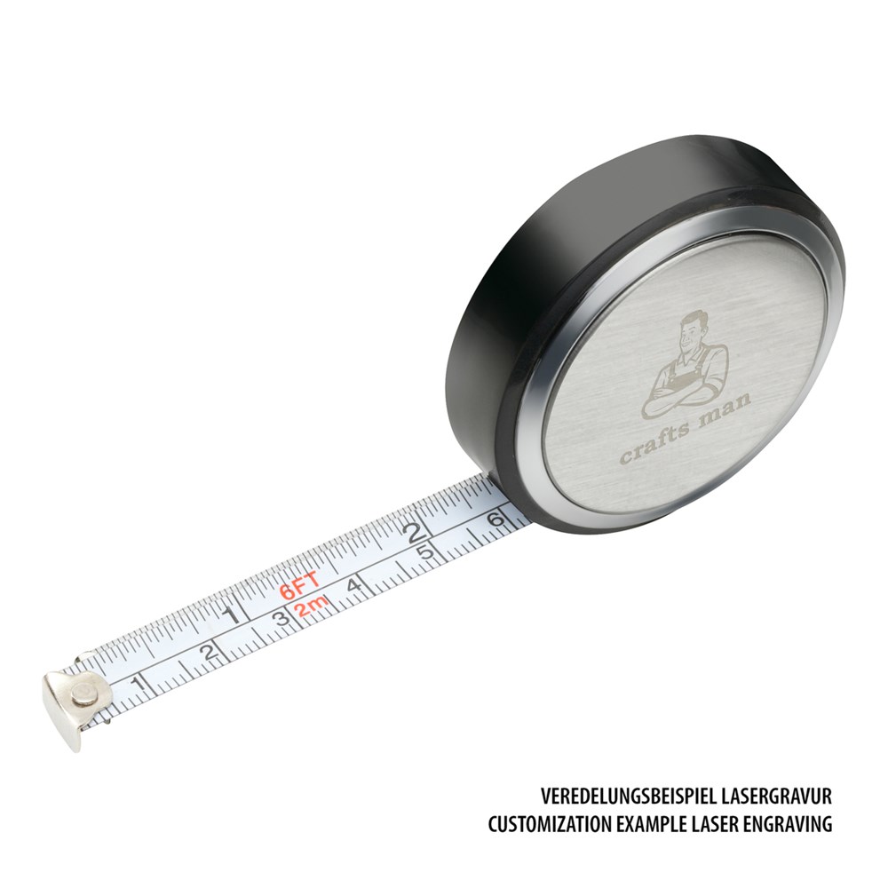 Praktische rolbandmaat van metaal met metrische en Engelse meeteenheden (voet). Het meetlint is 2 meter lang. De behuizing is gemaakt van zwart kunststof en zilverkleurig metaal. De behuizing kann worden bewerkt met doming, lasergravering, UV-druk of met een één- tot vierkleurige tampondruk.