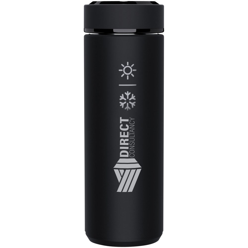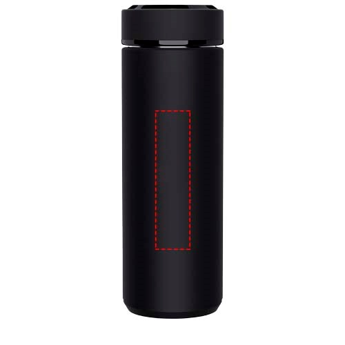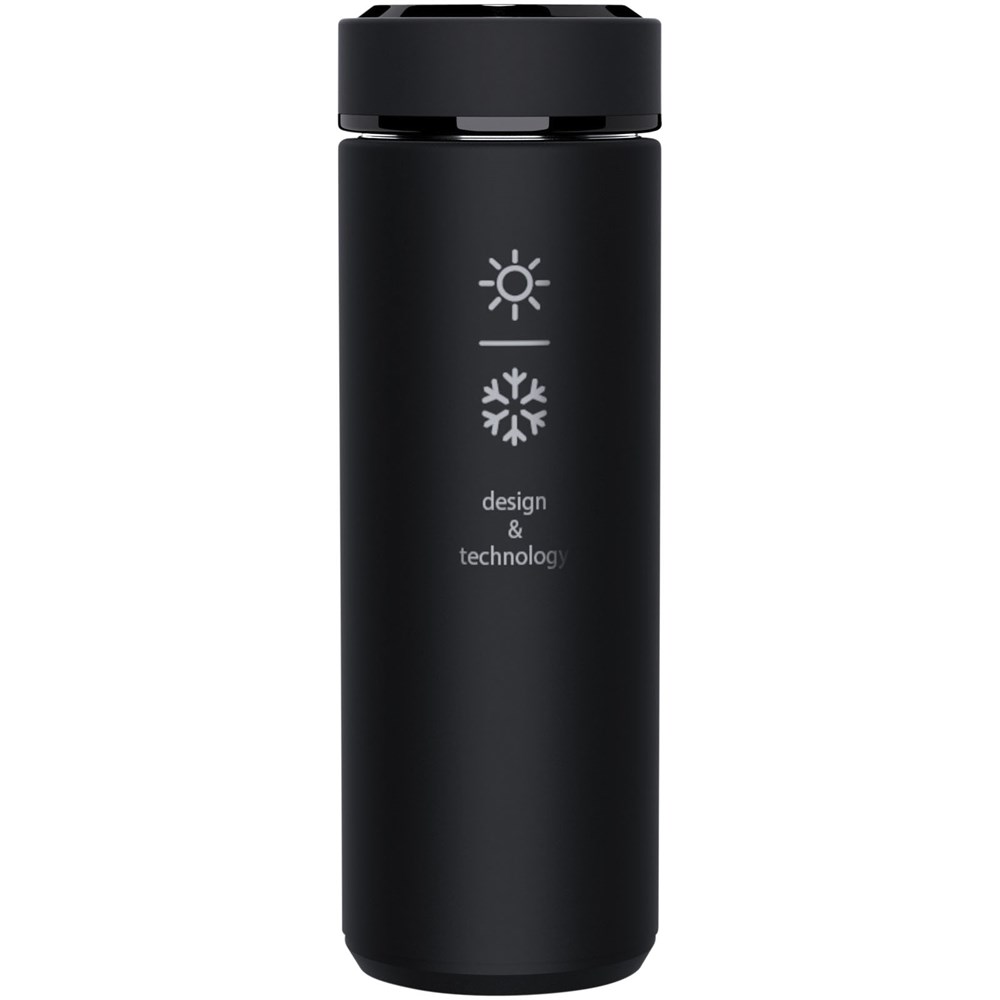 450 ml dubbelwandig geïsoleerde RVS fles met een temperatuursensor. Door het "Touch & Light"-systeem wordt de temperatuur van uw drank weergegeven op de flessendop (in Celsius). Geschikt voor warme en koude dranken. Geleverd in een cilindervormige geschenkverpakking gemaakt van gerecycled papier. Afmetingen: Ø 47 x 225 mm. Inclusief batterij: CR 2450 (3V). Batterij kan niet worden vervangen. Kan de temperatuur tot 20.000 keer weergeven.