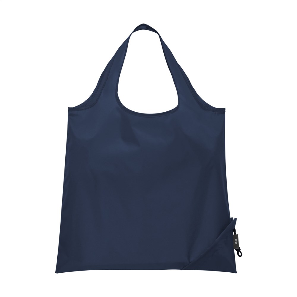 Opvouwbare, royale winkeltas van RPET polyester, gemaakt van gerecyclede PET-flessen. Met dubbele draaglus. In een handomdraai van pouch naar tas en andersom. Afm. opgevouwen 8 x 8 x 6 cm. GRS-gecertificeerd. Totaal gerecycled materiaal: 90%. Inhoud ca. 8 liter.