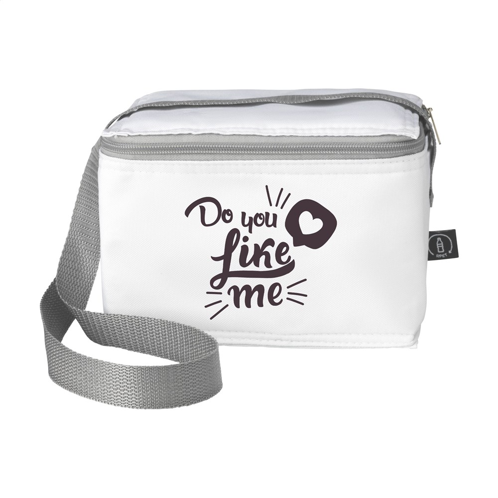 Koeltasje van 600D RPET polyester. Geschikt voor 6 blikjes drank. Met draagriem. GRS-gecertificeerd. Totaal gerecycled materiaal: 51%. Inhoud ca. 3 liter.