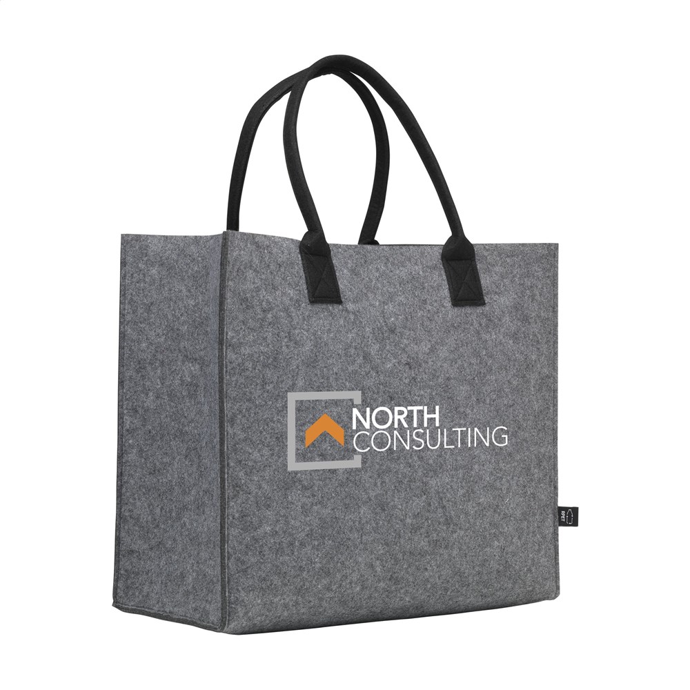 Stoere boodschappentas van stevig 2 mm RPET vilt. De tas biedt enorm veel ruimte. De dubbel genaaide draaglussen zijn sterk, hebben een praktische afmeting en bieden extra comfort bij het dragen. GRS-gecertificeerd. Totaal gerecycled materiaal 97%. Inhoud 28 liter.