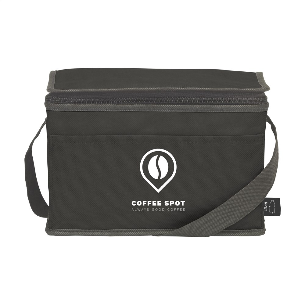 Koeltasje van nonwoven gerecycled polyester (80 g/m²). Geschikt voor 6 blikjes drank of etenswaren. Functioneel, compact, licht en sterk. Met draagriem. GRS-gecertificeerd. Totaal gerecycled materiaal: 82%. Inhoud ca. 4 liter.