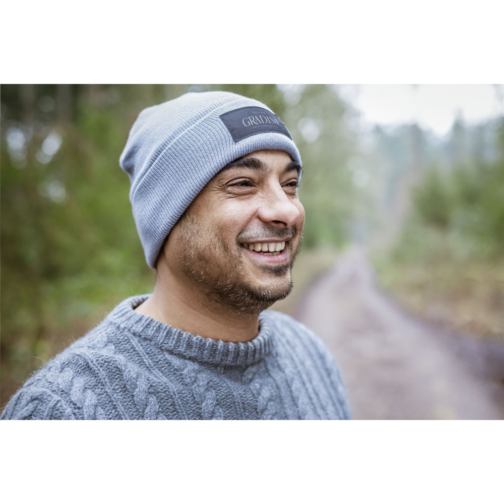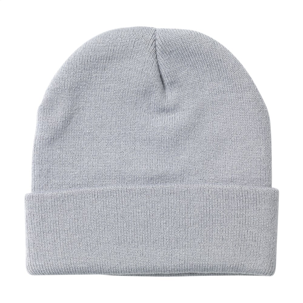 Gebreide muts met omslag. Van 100% RPET polyester. Populair, lekker warm en goede kwaliteit. One size. Met zwart label voor decoratie. GRS-gecertificeerd. Totaal gerecycled materiaal: 100%.