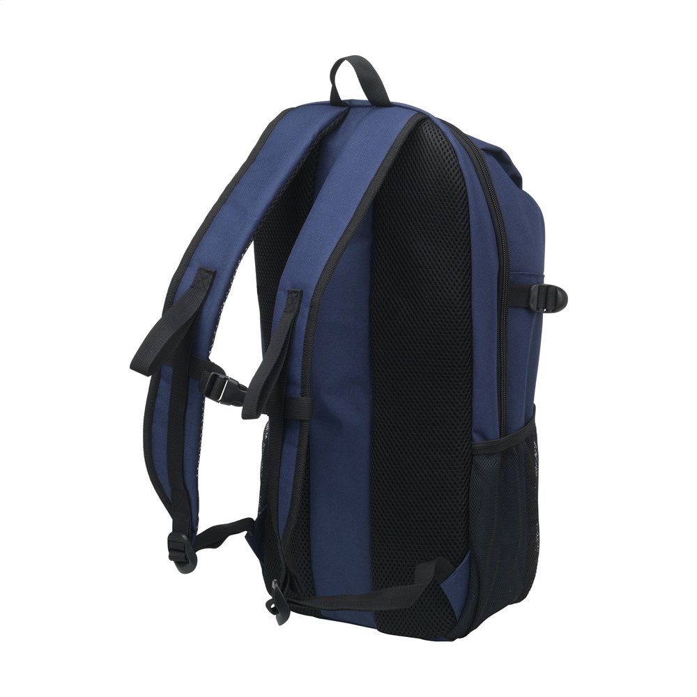 Rugzak van stevig RPET polyester. Een smal model met een royaal compartiment met ruimte voor het veilig vervoeren van een laptop tot 15,6 inch. Met extra ritsvak aan de voorzijde en een meshvak aan beide zijdes. De verstelbare schouderriemen en het achterpaneel zijn bekleed met mesh stof en voorzien van foam voor extra draagcomfort. De verstelbare schouderriemen hebben extra lussen en een band om de riemen op hun plaats te houden tijdens het dragen. Met stevige ritsen, volledig gevoerd en keurig afgewerkt. Een compacte rugzak met verrassend veel ruimte. GRS-gecertificeerd. Totaal gerecycled materiaal: 92%. Inhoud ca. 12 liter.