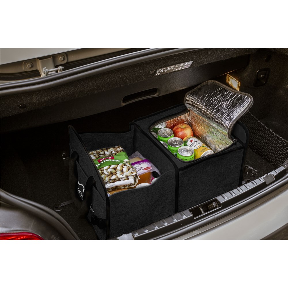 Praktische, opvouwbare organizer met koelvak, voor in de kofferbak van je auto. Gemaakt van stevig RPET vilt. Voorzien van een opbergcompartiment met bodemplaat en een afsluitbaar, ruim koelvak. Met extra voorvak en een mesh zijvak voor extra opbergruimte. Deze organizer is ideaal voor het opbergen van bijv. oplaadkabels en het koel opbergen en vervoeren van boodschappen. Afm. uitgevouwen 31 x 28 x 48 cm. Afm. opgevouwen 31 x 28 x 6 cm. Inhoud ca. 41 liter. GRS-gecertificeerd. Totaal gerecycled materiaal: 56%.