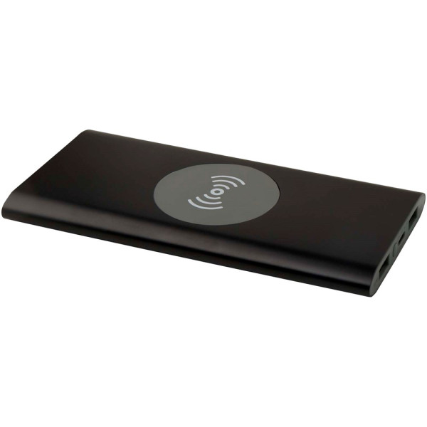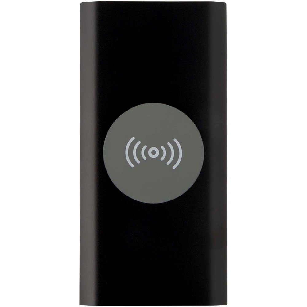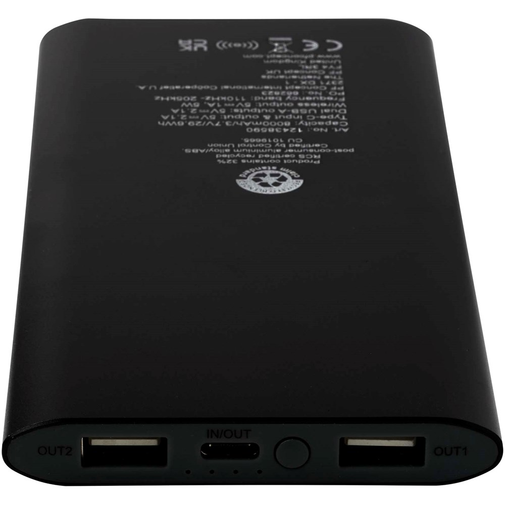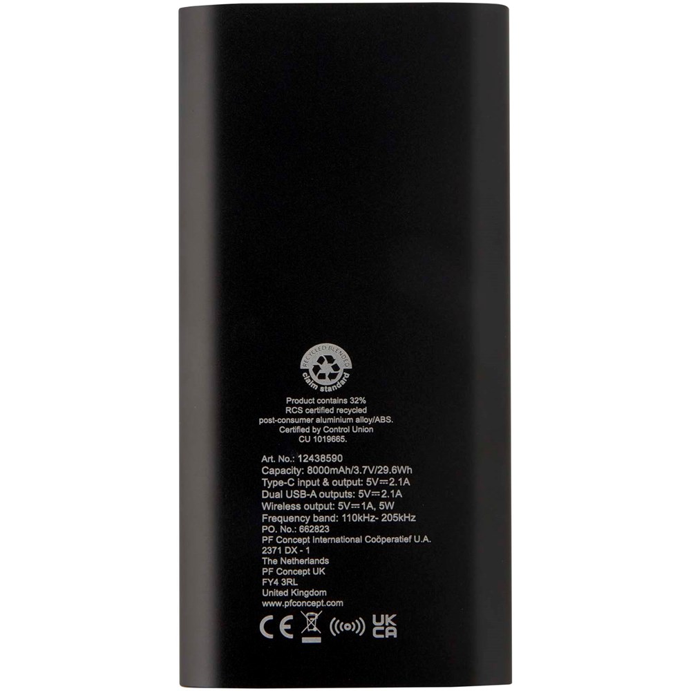 Powerbank met Type-C in/uitgangspoort en 2 x USB-A-poorten, wat betekent dat drie apparaten tegelijk kunnen worden opgeladen. Het ondersteunt ook 5 W draadloos opladen voor alle apparaten met Qi. De powerbank heeft een 8000 mAh lithium-polymeerbatterij die een totaal uitgangsvermogen levert van max. 10 W. Deze powerbank is gemaakt van 28% RCS gecertificeerd gerecycled plastic. Geleverd met een TPE Type-C naar USB-A-oplaadkabel.