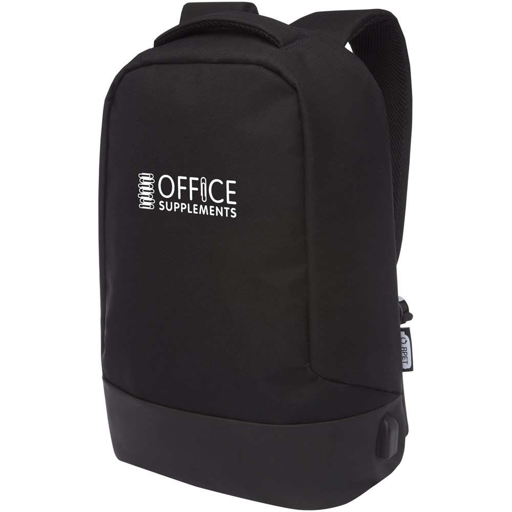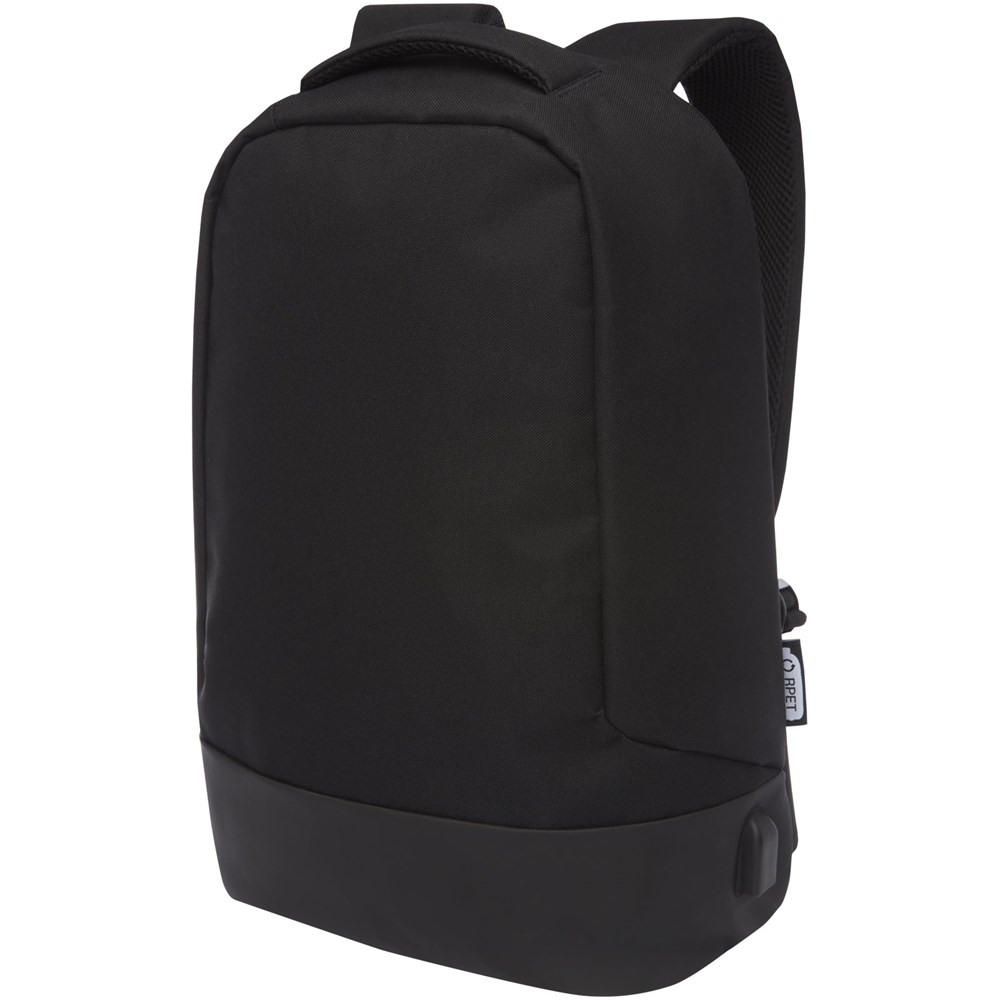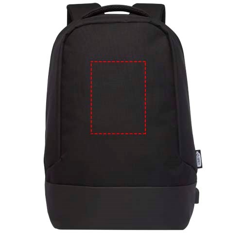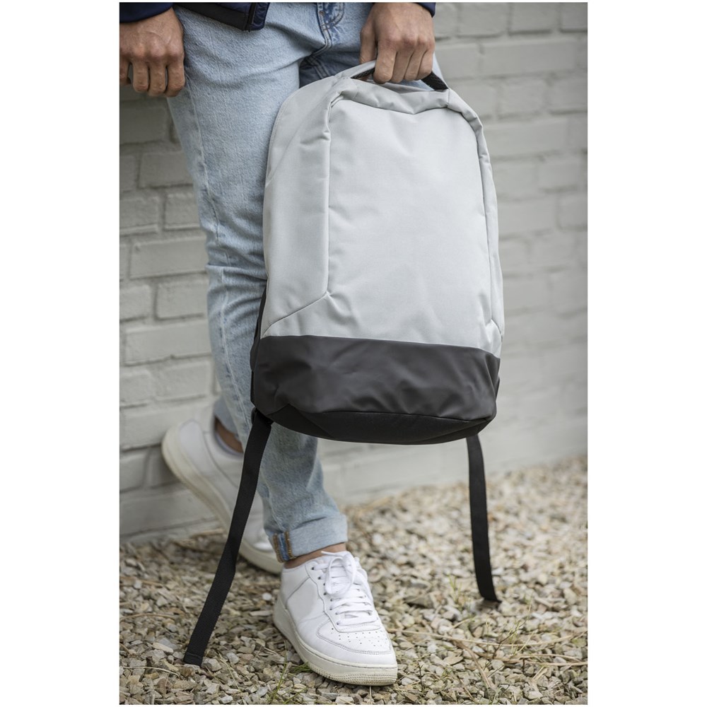 GRS gecertificeerd rugzak voorzien van een open hoofdvak met opbergpanel, gevoerde 15" laptophoes en 2 RFID beschermvakken. USB poort aan de rechterkant om eenvoudig apparaten van binnenuit aan te sluiten en op te laden. Wordt geleverd met gevoerde schouderbanden, rechterschouderband, verborgen ritsvak, handgreep en een trolleydoorvoer. Er worden ongeveer 15 plastic flessen gerecycled om deze tas te maken.