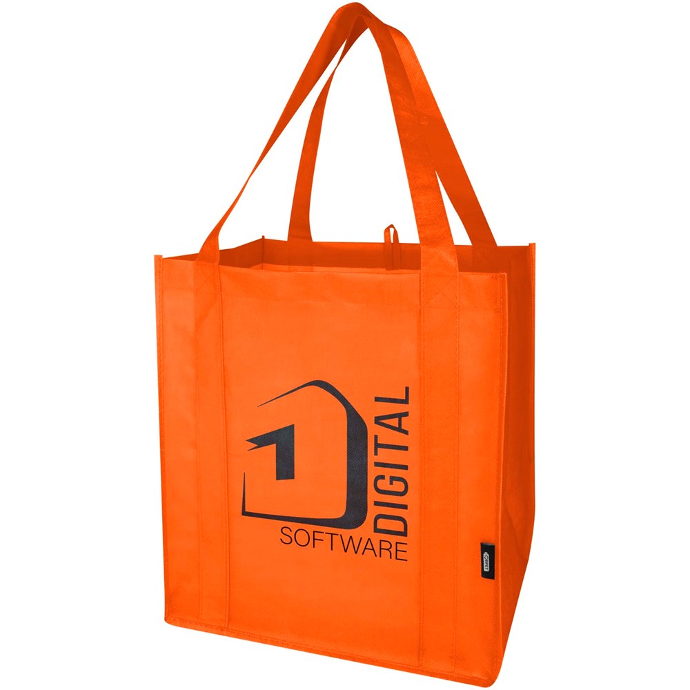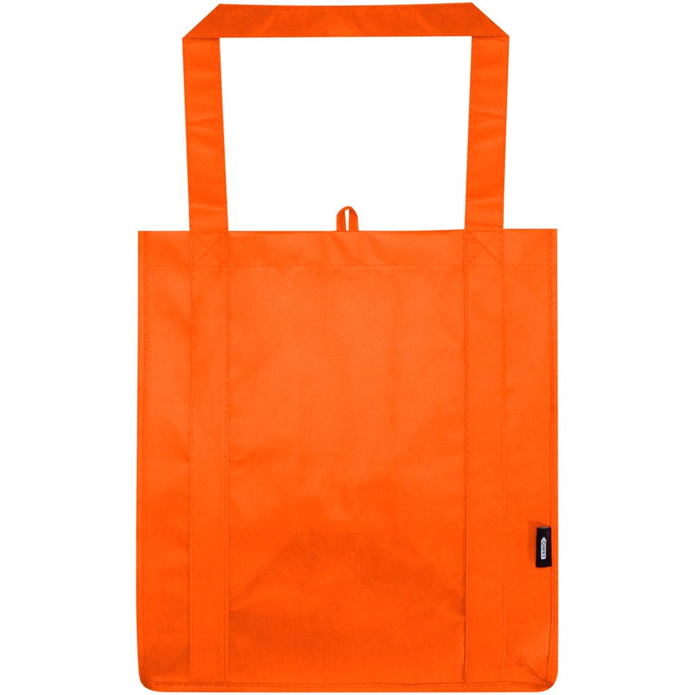 Gemaakt van duurzaam en scheurbestendig niet-geweven RPET. De Liberty GRS gecertificeerde gerecyclede draagtas beschikt over een ondersteunende bodem, waardoor hij veelzijdig en stevig is. De draagtas heeft een groot hoofdvak en 25 cm lange handvatten. Inhoud: 29 liter. Geschikt voor een gewicht tot 12 kg.