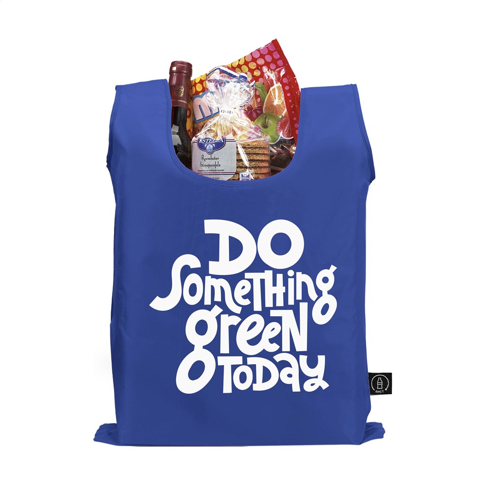 Opvouwbare winkeltas van 190T RPET polyester. Met opbergetui voorzien van drukknoop en karabijnhaak. De tas wordt ongevouwen met los etui geleverd. Afm. opgevouwen 6 x 2,5 x 12,5 cm. Totaal gerecycled materiaal: 90%. Inhoud ca. 8 liter.