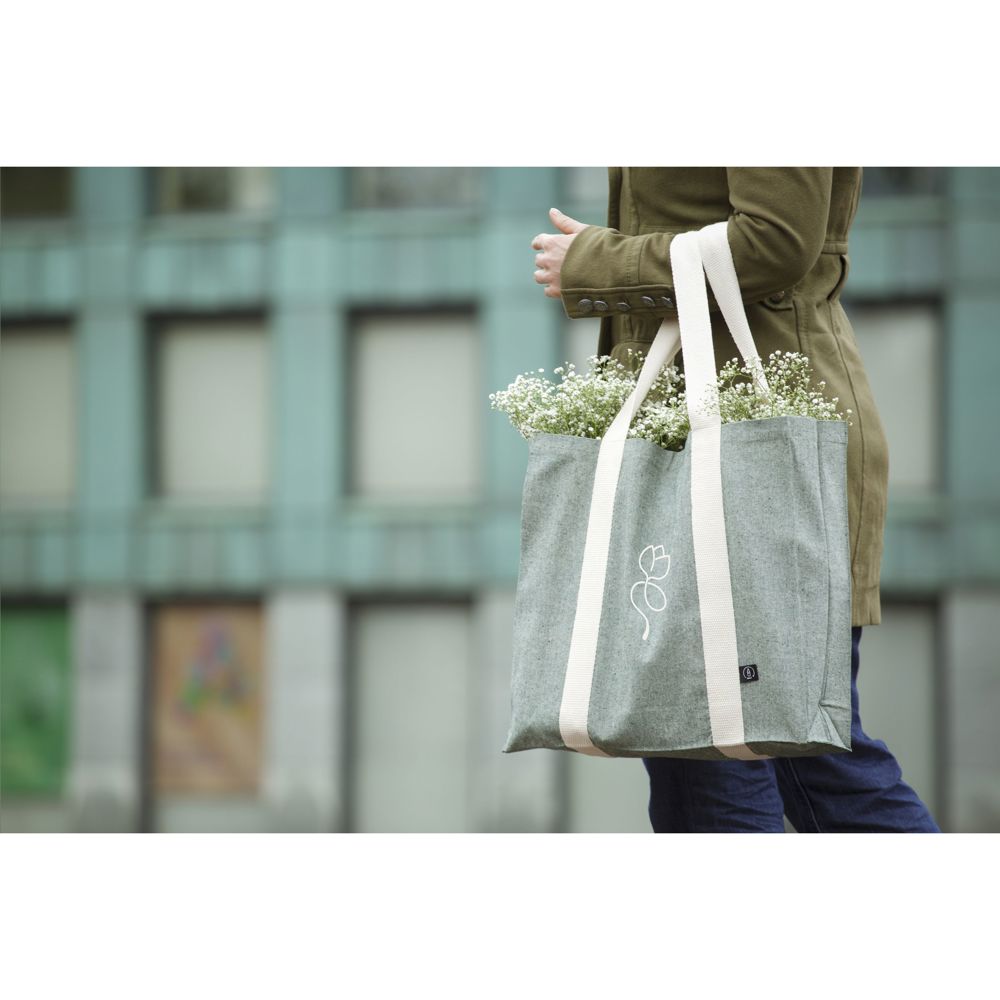 Royale, stevige winkeltas van 80% gerecycled, gemêleerd katoen en 20% gerecycled, gemêleerd polyester (210 g/m²). Met dichte, platte weving, lange hengsels en brede bodem. De hengsels zijn uitgevoerd in een opvallende geweven structuur en lopen als stevige banden verticaal over de tas, een fraai en decoratief detail. De tas is geschikt voor veelvuldig hergebruik. GRS-gecertificeerd. Inhoud ca. 18 liter.