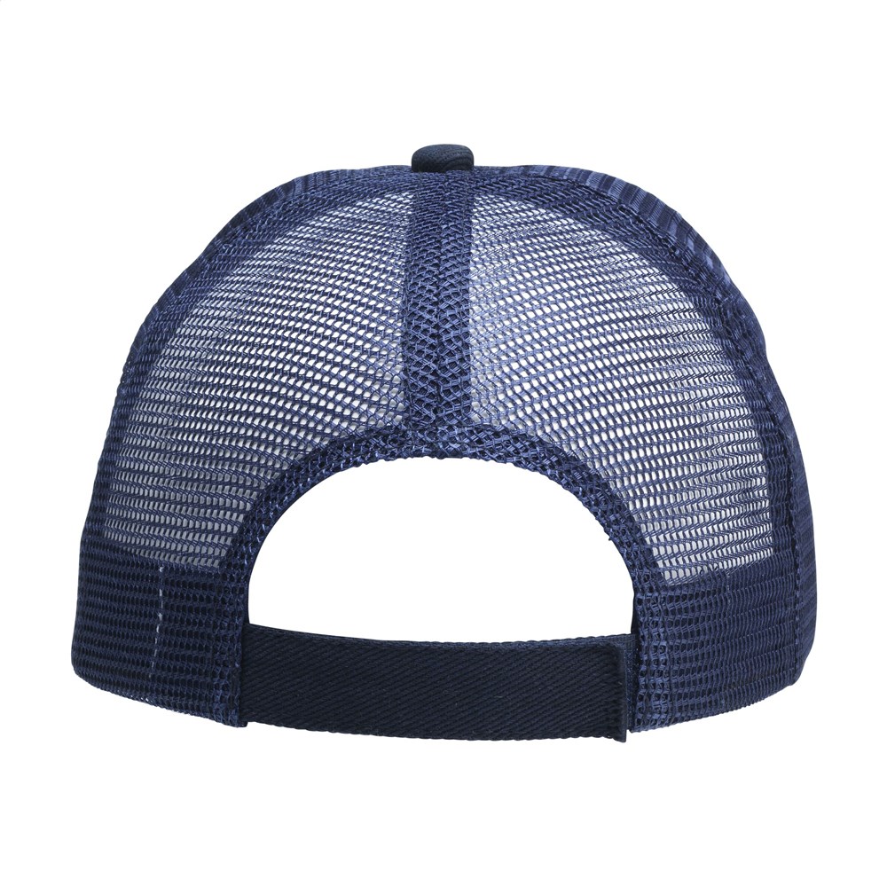 Trucker cap met 5 panelen en voorgevormde, gebogen klep gemaakt van 60% geborsteld, gerecycled katoen en 40% gerecycled polyester. Achterzijde in mesh structuur (polyester) voor optimale ventilatie. Met klittenbandsluiting.
