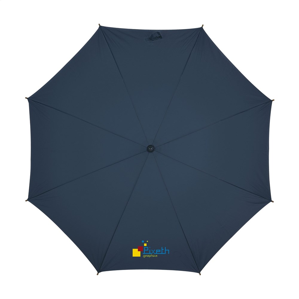 Paraplu met 190T polyester bespanning, metalen frame, houten steel en handgreep en klittenbandsluiting.