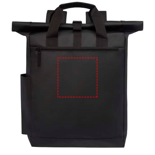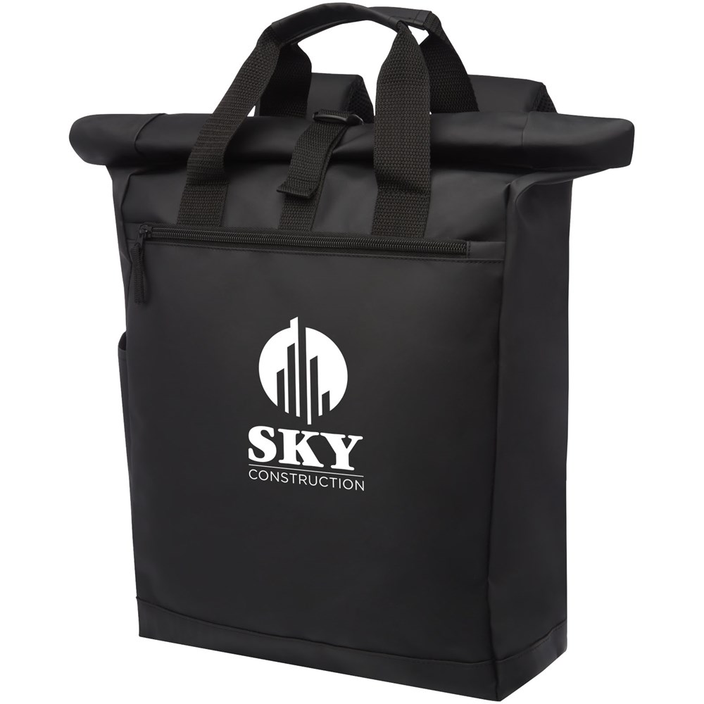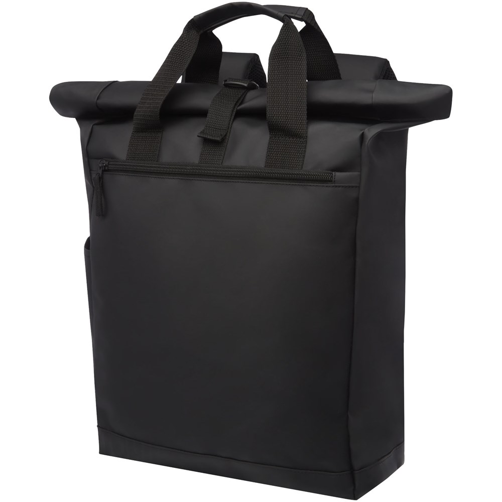 Waterbestendige rugzak met gewatteerd laptopvak, gewatteerde verstelbare schouderbanden, hoofdvak met ritssluiting, rolsluiting en 2 handgrepen.