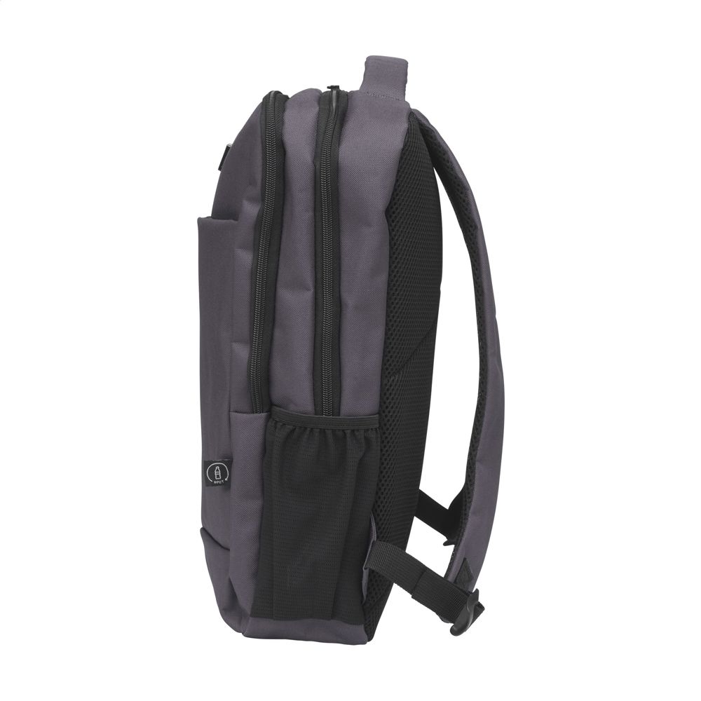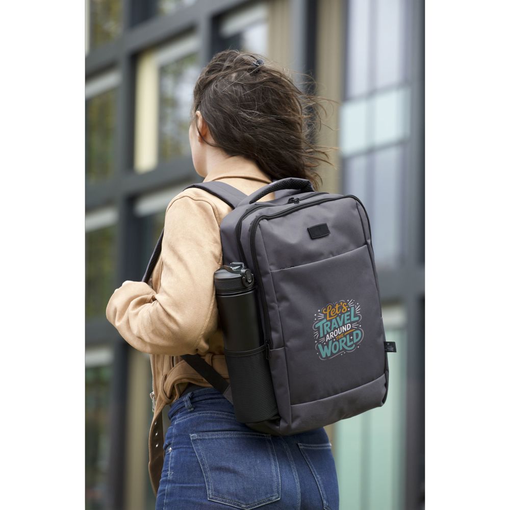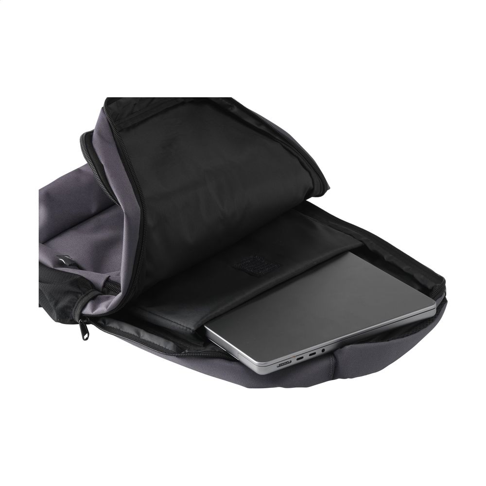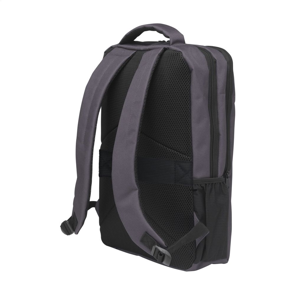 Solide rugzak van stevig RPET polyester. Met 2 royale compartimenten. Het eerste vak heeft veel ruimte en diverse insteekvakken voor het overzichtelijk opbergen van accessoires. Het tweede vak heeft een foam beschermvak voor het veilig vervoeren van een laptop tot 15,6 inch. Met extra ritsvak aan de voorzijde en een meshvak aan beide zijdes. De verstelbare schouderriemen, het achterpaneel en de handgreep zijn bekleed met mesh stof en voorzien van foam voor extra draagcomfort. Met extra lus om de rugzak aan een trolley te bevestigen, stevige ritsen, volledig gevoerd en keurig afgewerkt. Een luxe rugzak met vele extra's. GRS-gecertificeerd. Totaal gerecycled materiaal: 90%. Inhoud ca. 12 liter.