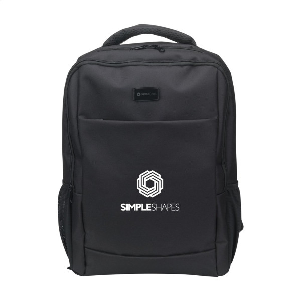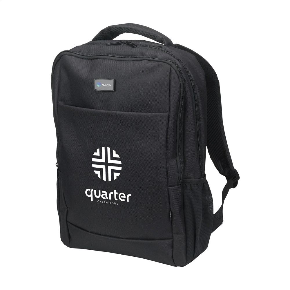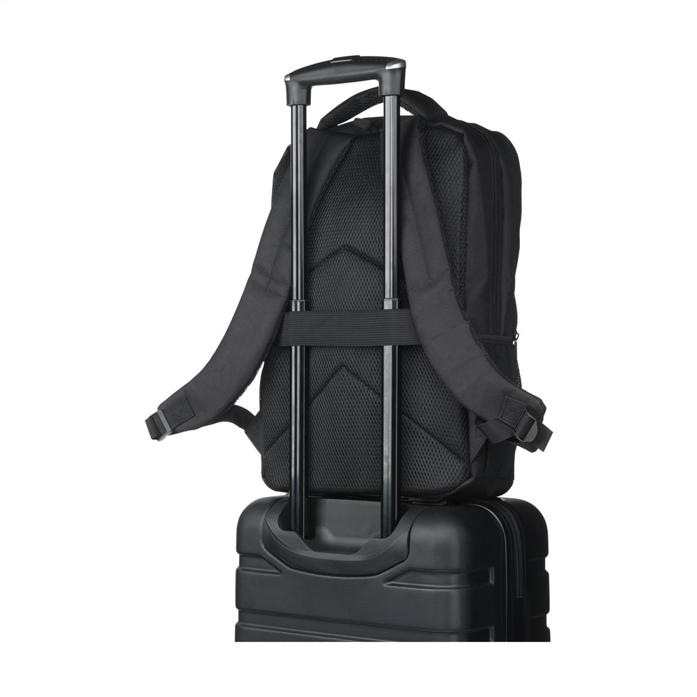 Solide rugzak van stevig RPET polyester. Met 2 royale compartimenten. Het eerste vak heeft veel ruimte en diverse insteekvakken voor het overzichtelijk opbergen van accessoires. Het tweede vak heeft een foam beschermvak voor het veilig vervoeren van een laptop tot 15,6 inch. Met extra ritsvak aan de voorzijde en een meshvak aan beide zijdes. De verstelbare schouderriemen, het achterpaneel en de handgreep zijn bekleed met mesh stof en voorzien van foam voor extra draagcomfort. Met extra lus om de rugzak aan een trolley te bevestigen, stevige ritsen, volledig gevoerd en keurig afgewerkt. Een luxe rugzak met vele extra's. GRS-gecertificeerd. Totaal gerecycled materiaal: 90%. Inhoud ca. 12 liter.