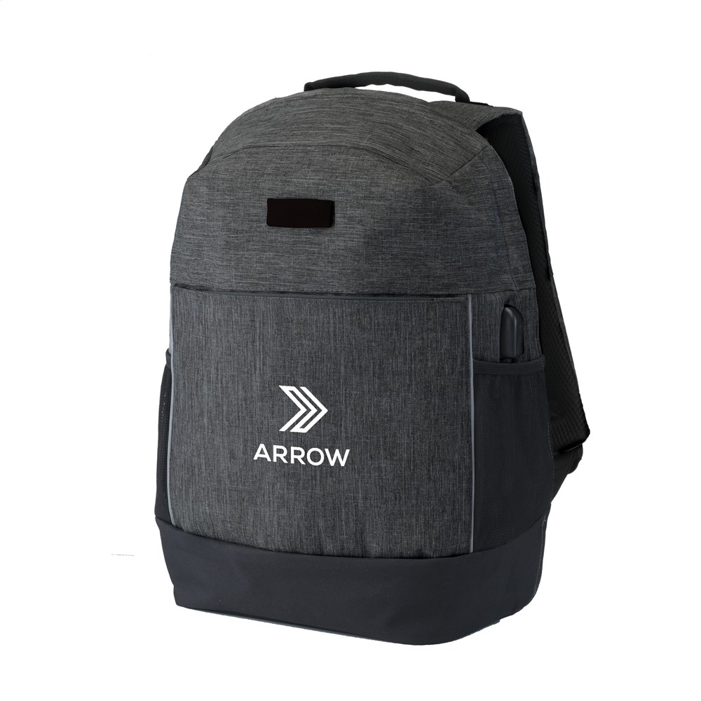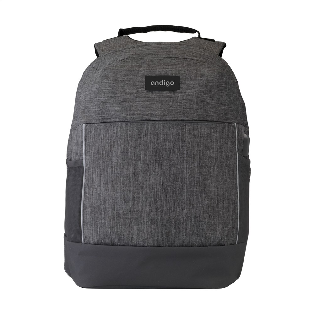 Zeer complete, weerbestendige en veilige 'anti-theft' rugzak van 300D Oxford 2-tone polyester. Met verborgen ritssluitingen aan de achterzijde die zakkenrollen en ongewenste toegang tot de inhoud bemoeilijken. Het ruime hoofdvak, dat nagenoeg geheel geopend kan worden, is voorzien van foamvakken voor een laptop tot 15,6" en voor een tablet tot 12", een ritsvak en diverse insteekvakken. Aan de voorzijde van de rugtas, een ritsvak, reflecterende accenten voor veiligheid in het donker en aan de zijkant gaasvakken voor het handig meenemen van een drinkfles. Zowel de rugzijde als de verstelbare schouderriemen zijn voorzien van stevig foam en afgewerkt met gaas in mesh-structuur. Op de bovenzijde en in beide schouderriemen zijn verborgen, RFID-blokkerende, ritsvakjes verwerkt die ‘skimmen’ voorkomen. Met verstevigde bodem, draaglus en een extra lus om de rugzak aan een trolley te bevestigen. Inclusief USB aansluiting met oplaadkabel. De tas is mooi afgewerkt, weerbestendig, keurig gevoerd en het draagcomfort is gegarandeerd. Inhoud ca. 20 liter.