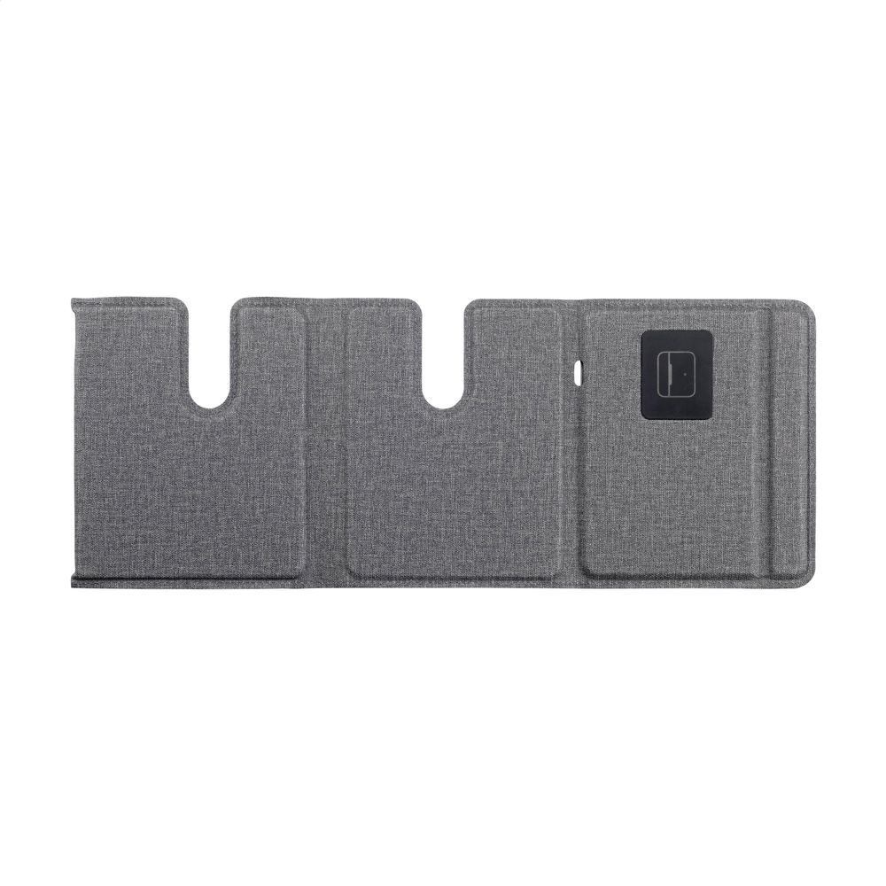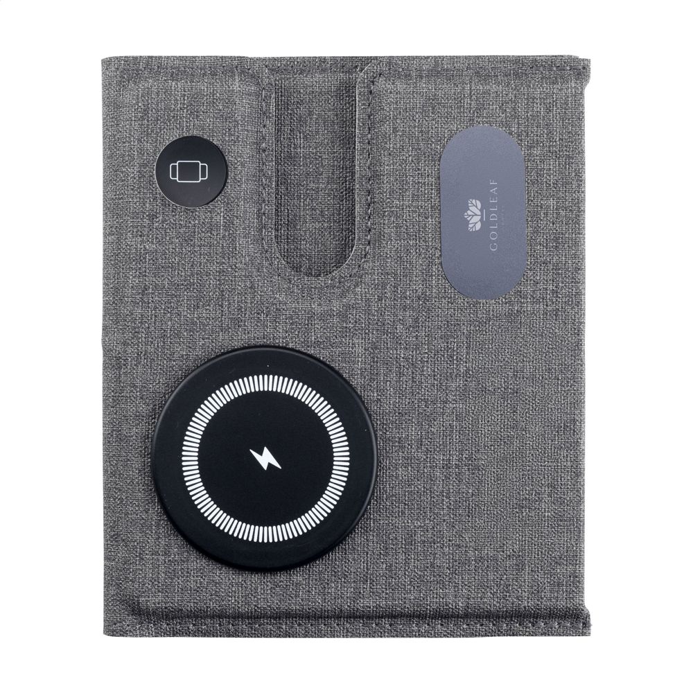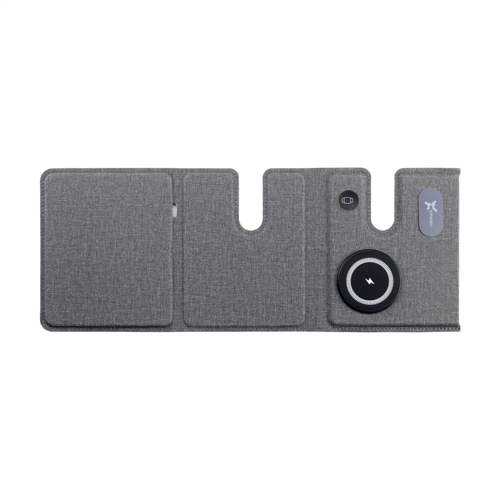 3-in-1 magnetische, draadloze 15 W oplader van gerecycled ABS en gerecycled PU met een grijs gemêleerd motief. Dit laadstation ondersteunt het snel draadloos opladen: 15W voor een mobiele telefoon 2,5W voor je iWatch en 3W voor TWS oortjes. Input: 1 x USB-C 9V/3A. De ingebouwde, magnetische snellader is compatible met alle apparaten die Qi draadloos laden ondersteunen. Plaats dit docking station op je bureau en je werkplek blijft opgeruimd en je devices opgeladen. Opvouwbaar en gemakkelijk mee te nemen. Inclusief USB-C/USB-C oplaadkabel en gebruiksaanwijzing. RCS-gecertificeerd. Totaal gerecycled materiaal: 49%. Per stuk verpakt.