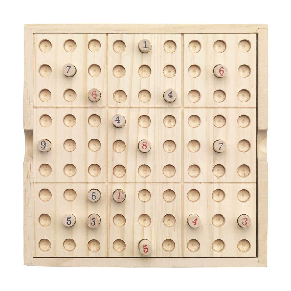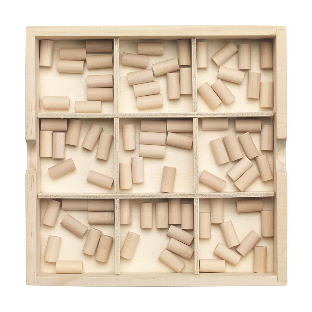 Luxe Sudokubord met deksel, gemaakt van FSC 100% gecertificeerd dennenhout. Het deksel is tevens het speelbord. De bijbehorende 81 pionnen zijn voorzien van getallen en op te bergen in de 9-vaks spellenkist. Inclusief ca. 10 speelkaarten en spelregels. Per stuk verpakt.