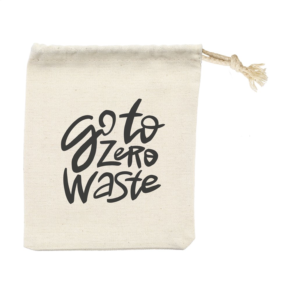 Set van 4 kurken onderzetters (Ø 10 cm) in een katoenen pouch. Verpakt in een wikkel van kraft papier.