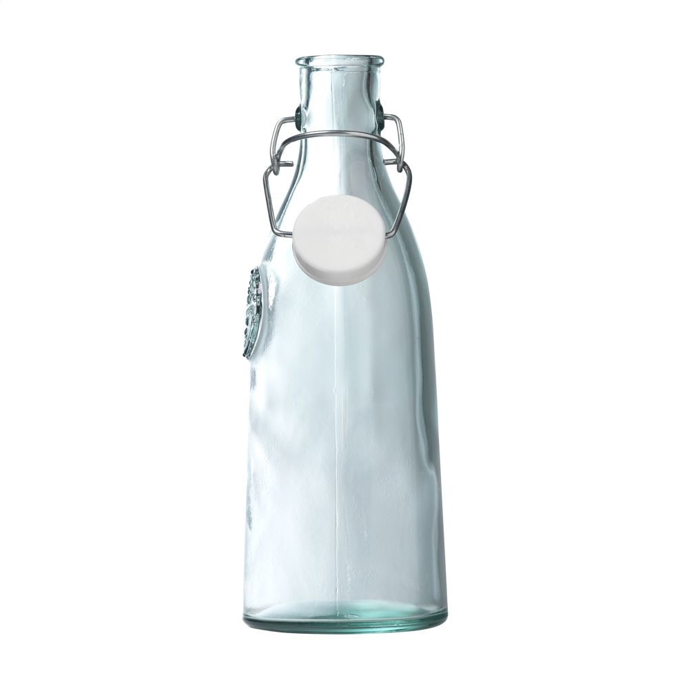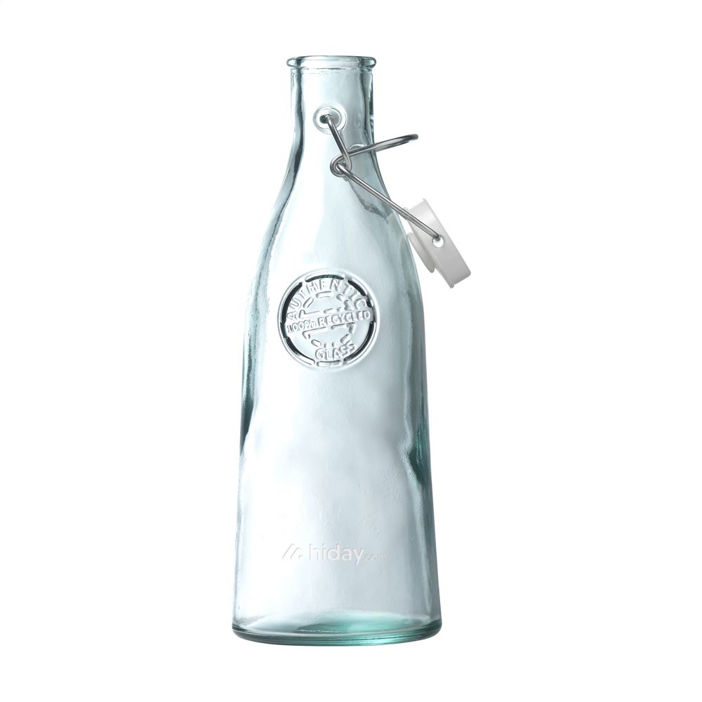 Decoratieve beugelfles van 100% gerecycled, stevig kwaliteitsglas. Afsluitbaar met een beugeldop. Een gezellige tafelfles met karakter. Het glas wordt gekenmerkt door de reliëftekst: 'Authentic Glass 100% recycled'. De blauwgroene tint van het glas is een natuurlijke eigenschap van gerecycled glas. De kleur en mogelijke oneffenheden benadrukken de schoonheid van imperfectie en dragen bij aan de authenticiteit van dit product. Recycling vermindert het verbruik van nieuwe grondstoffen, water en energie. Kleur, dikte en formaat kunnen per product verschillen. Made in Spain. Inhoud 1.000 ml.