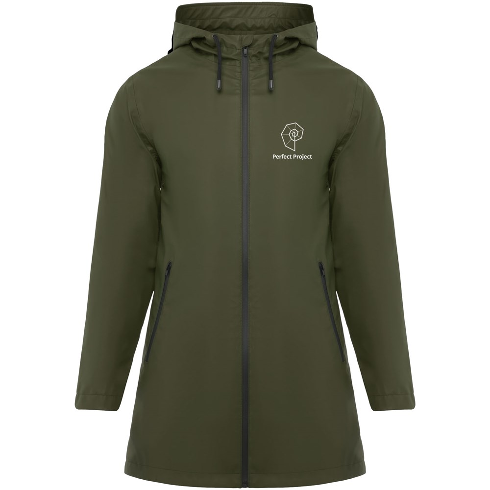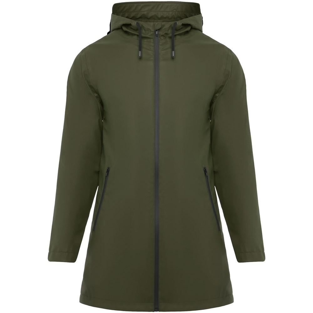 Waterdichte regenjas voor dames. Capuchon met klep. Door hitte gesealde ritsen en naden. Contrasterende details in zwart. Twee zijzakken met rits. Split aan de achterkant. Verwijderbaar etiket. Waterbestendig. Het model is 179 cm en draagt maat S.